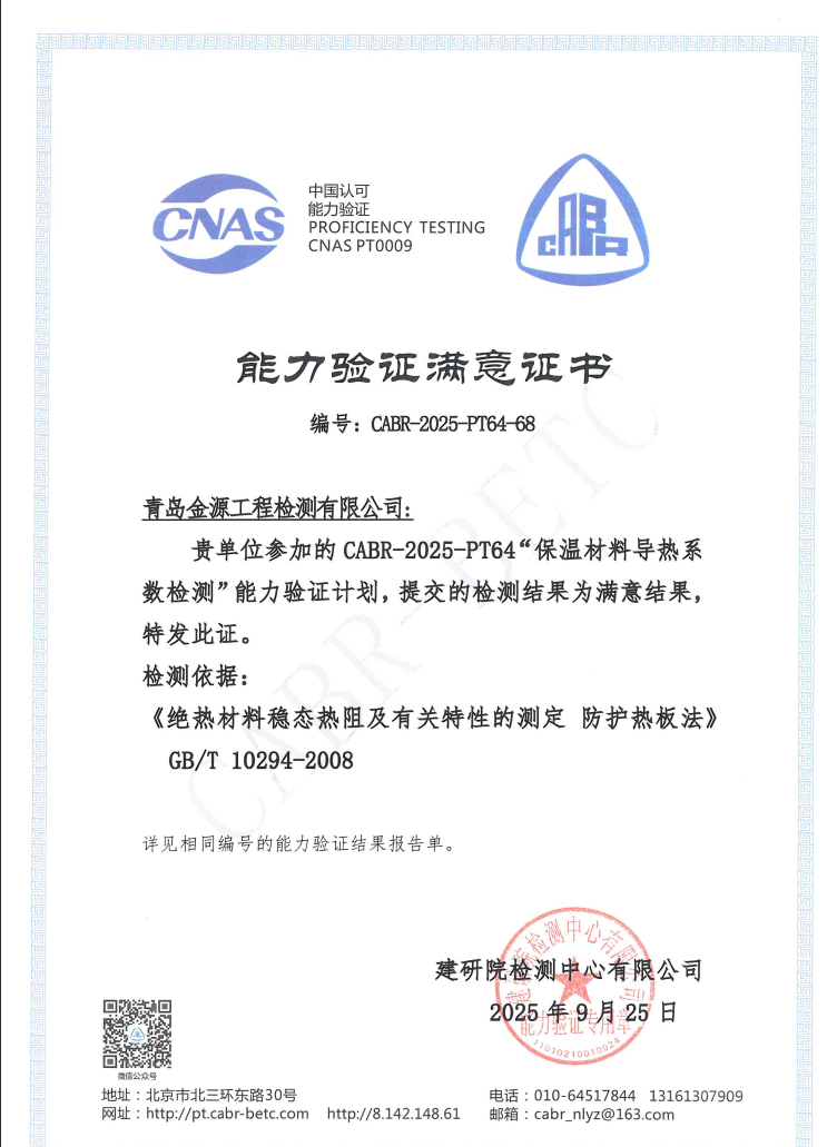 近日,国家建筑工程质量监督检验中心公布了2025年保温材料导热系数能力验证结果,我公司提交的检验结果在满意范围,顺利通过能力验证。