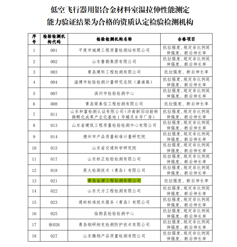 公司通过 低空飞行器用铝合金材料室温拉伸性能测定 能力验证结果为合格的资质认定检验检测机构